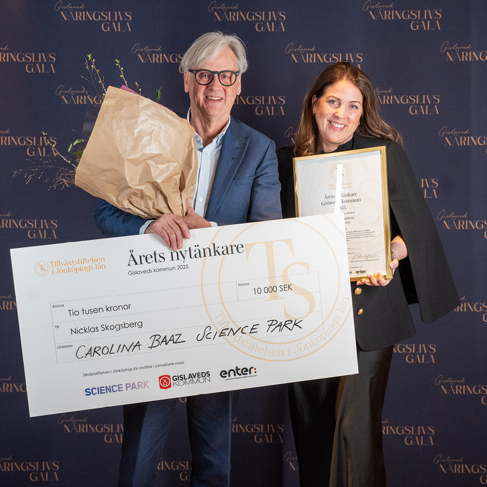 Årets Nytänkare delades ut av Tillväxtstiftelsen Jönköpings län och Science Park och gick till Nicklas Skogsberg. På plats för att ta emot priset under kvällen var Jan Pettersson.