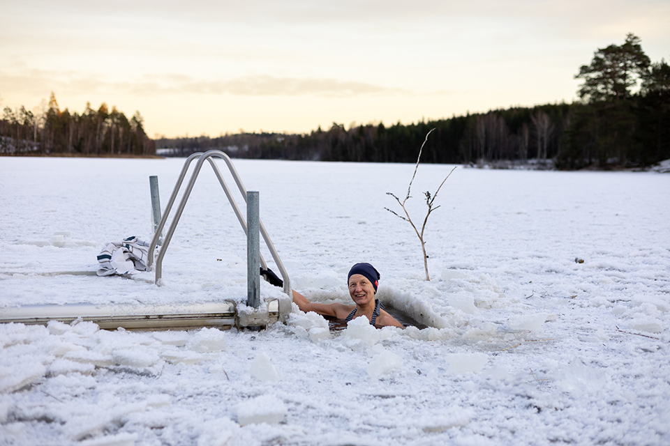 Sedan är det dags för själva kallbadet. Vi får vara med när Ulrika lugnt och kontrollerat kliver i det kalla vattnet. ”Sedan ska man bara tänka på att andas lugnt och stilla, och bara njuta av badet och naturen runtomkring.”