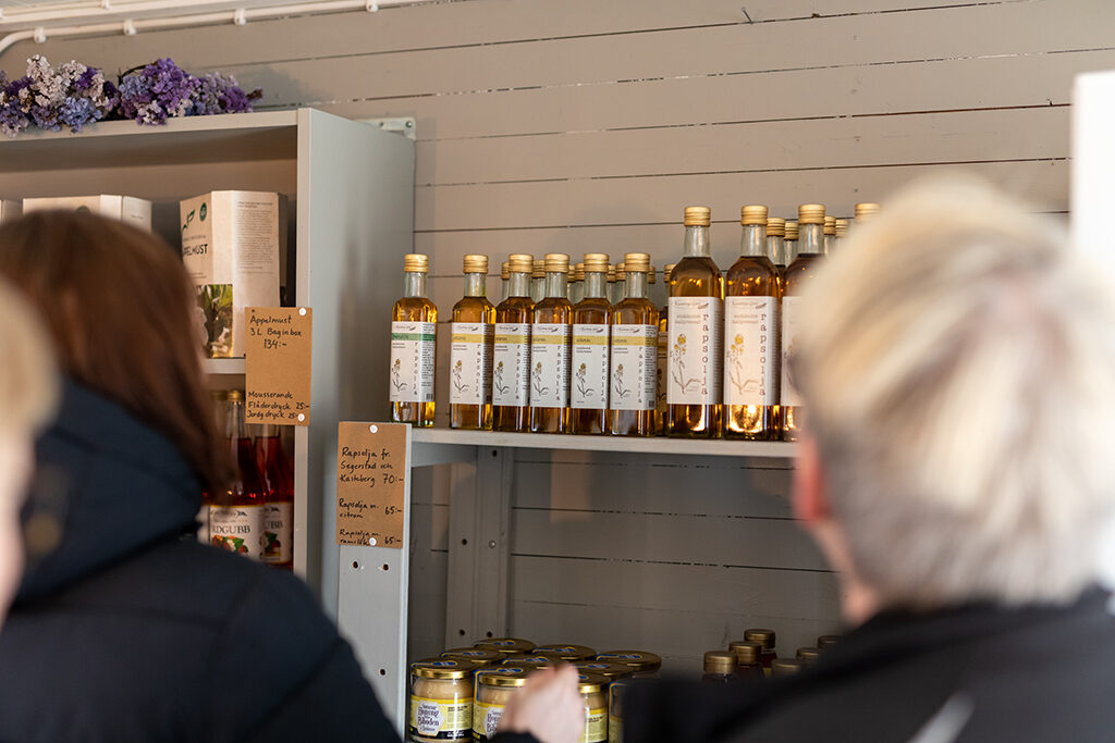 I grönsaksboden finns, förutom det Yvonne själv odlar, även ägg från hennes egna höns. Men hon köper också in en del annat och säljer i sin bod, som t.ex. äppelmust från Vistakulle och Brunneby musteri. Saft, sylt och honung finns också på hyllorna, och rapsolja från Kastebergs gård. Och även en del korgar och träredskap.